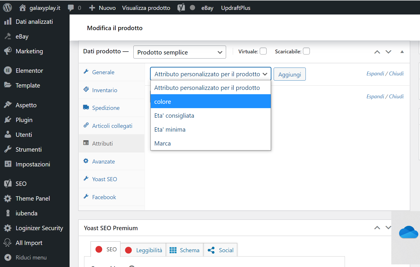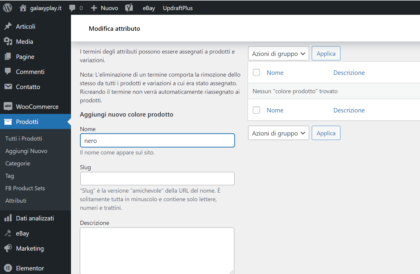 Trova la pagina del prodotto e clicca su “Modifica”. Scorri in basso e trova la voce “Attributi”. Scegli ad esempio l’attributo “Colore” e il suo valore “Nero”.