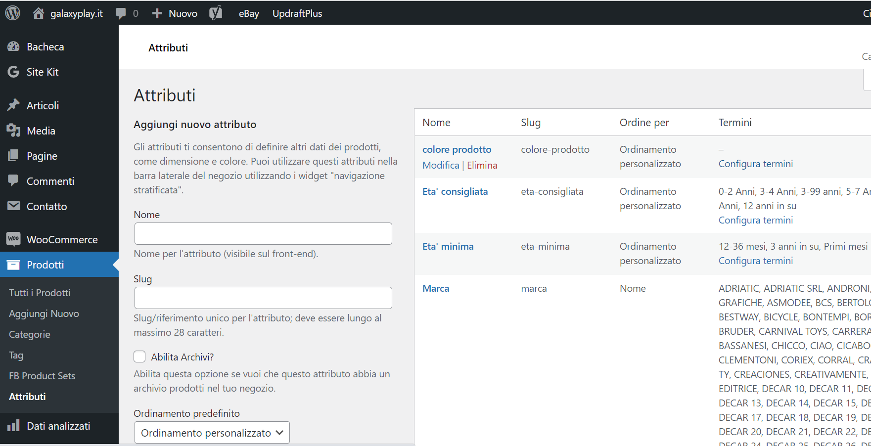 Qui poi inserire gli attributi dei tuoi prodotti: colore, marca e produttore.