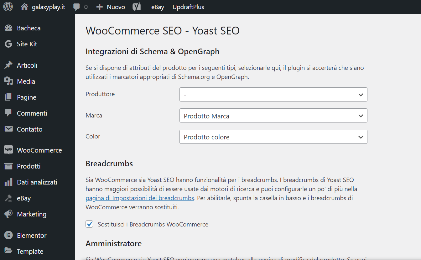 - Trova la schermata delle impostazioni di Schema e Open Graph