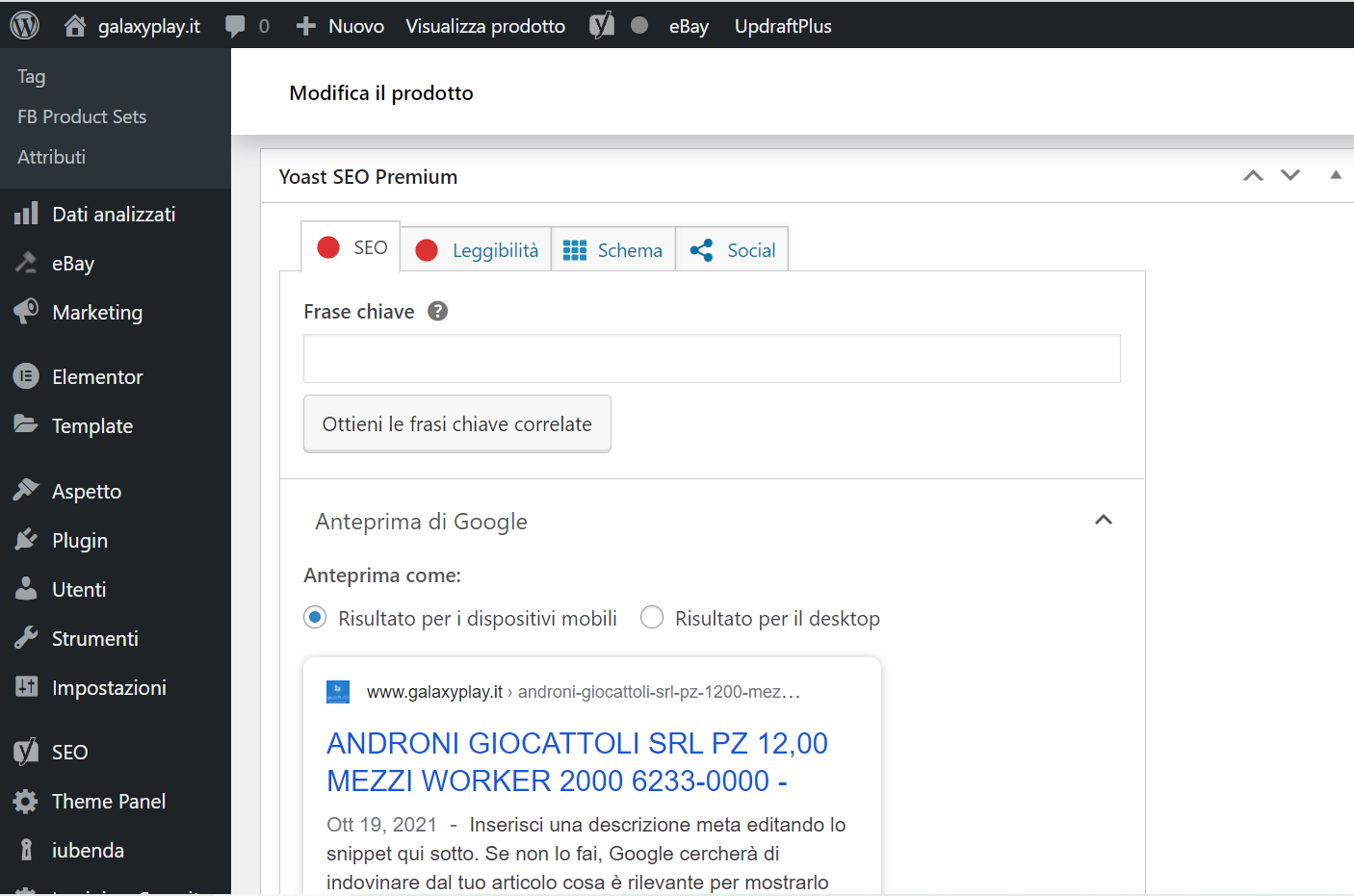 Vai nella pagina del prodotto e scorri in basso alla voce “Yoast SEO”. Dunque inserisci ID prodotto. Questa piccola operazione aumenta la visibilità dei tuoi prodotti nella SERP.